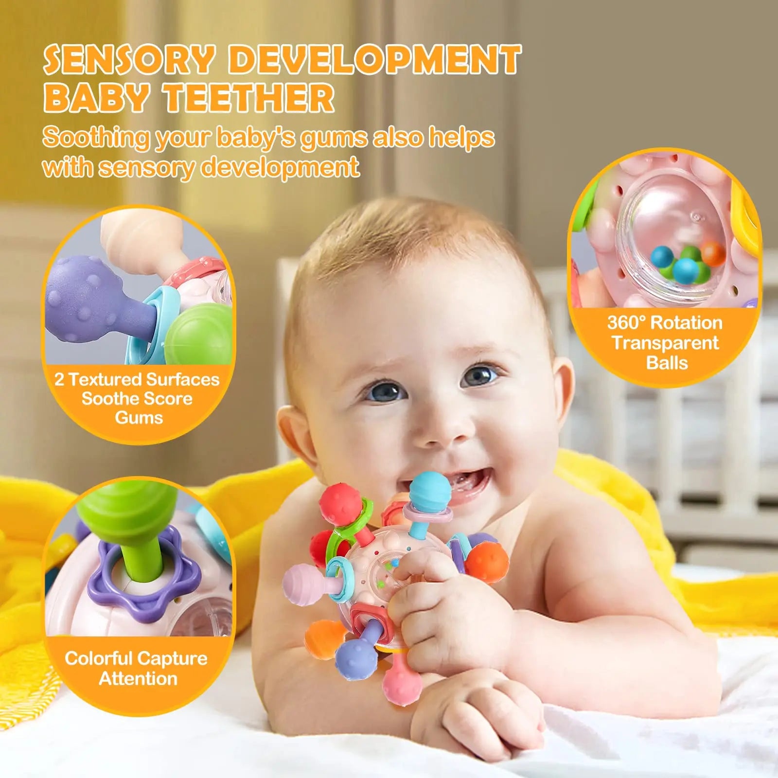 【Rattle & Ball Design】Teething toys are designed in a ball shape with 12 nibbling points to massage the teething bed to promote baby's sensory development and massage the gums to relieve teething pain